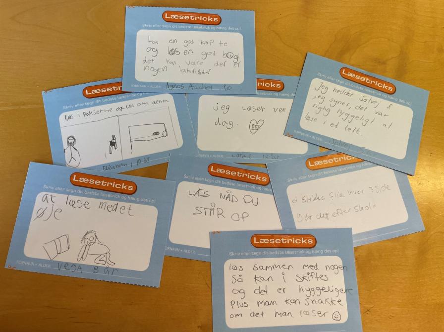 Tørresnoren har børnene brugt til at hænge postkort op med deres bedste læsetricks.